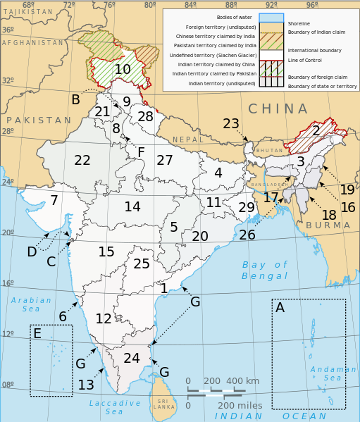 | 91 ? ? 25. Telangana, IN pop. 35,193,978 - IN-TS | 91 ? ? E. Lakshadweep, IN pop. 65,473 - IN-LD | 91 ? ? G. Puducherry, IN pop. 1,244,464 - IN-PY | 91 ? ? A. Andaman and Nicobar Islands*, IN pop. 380,520 - IN-AN |